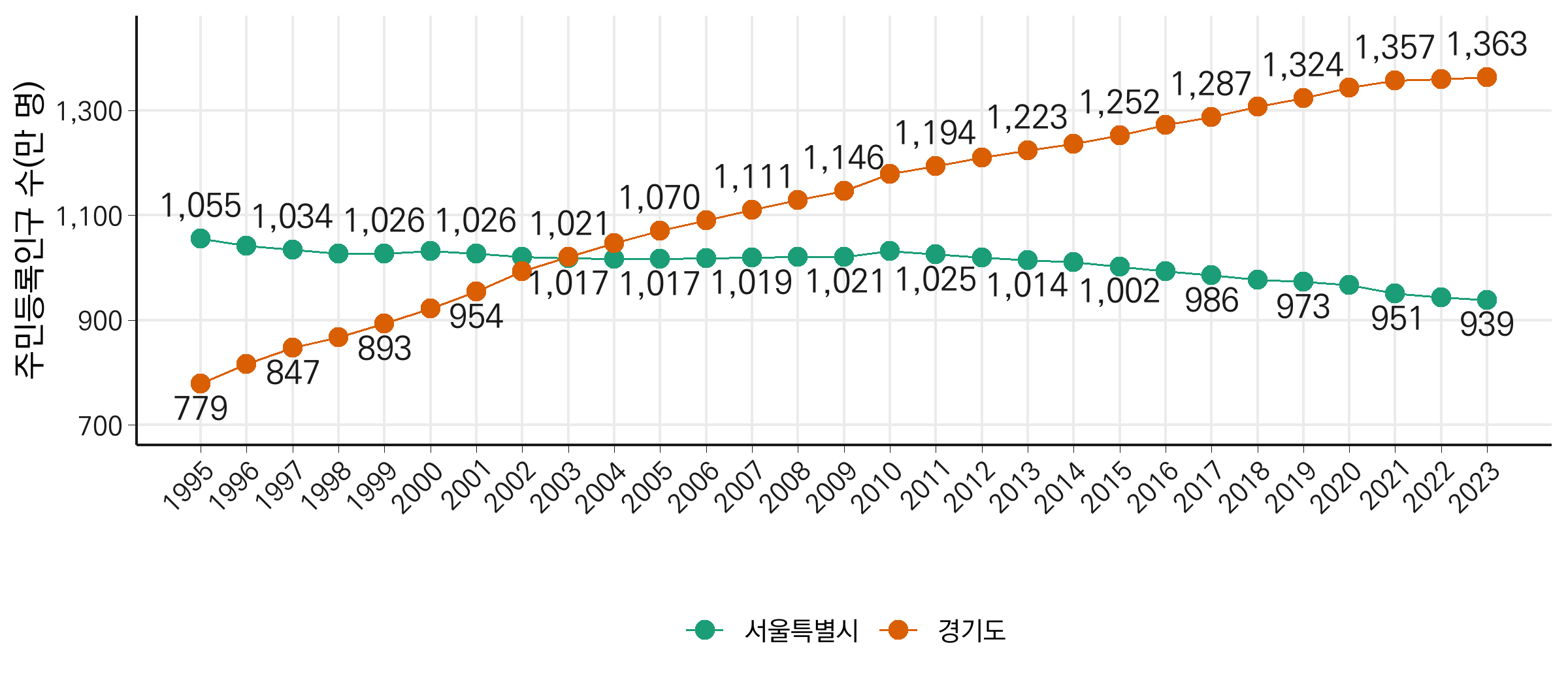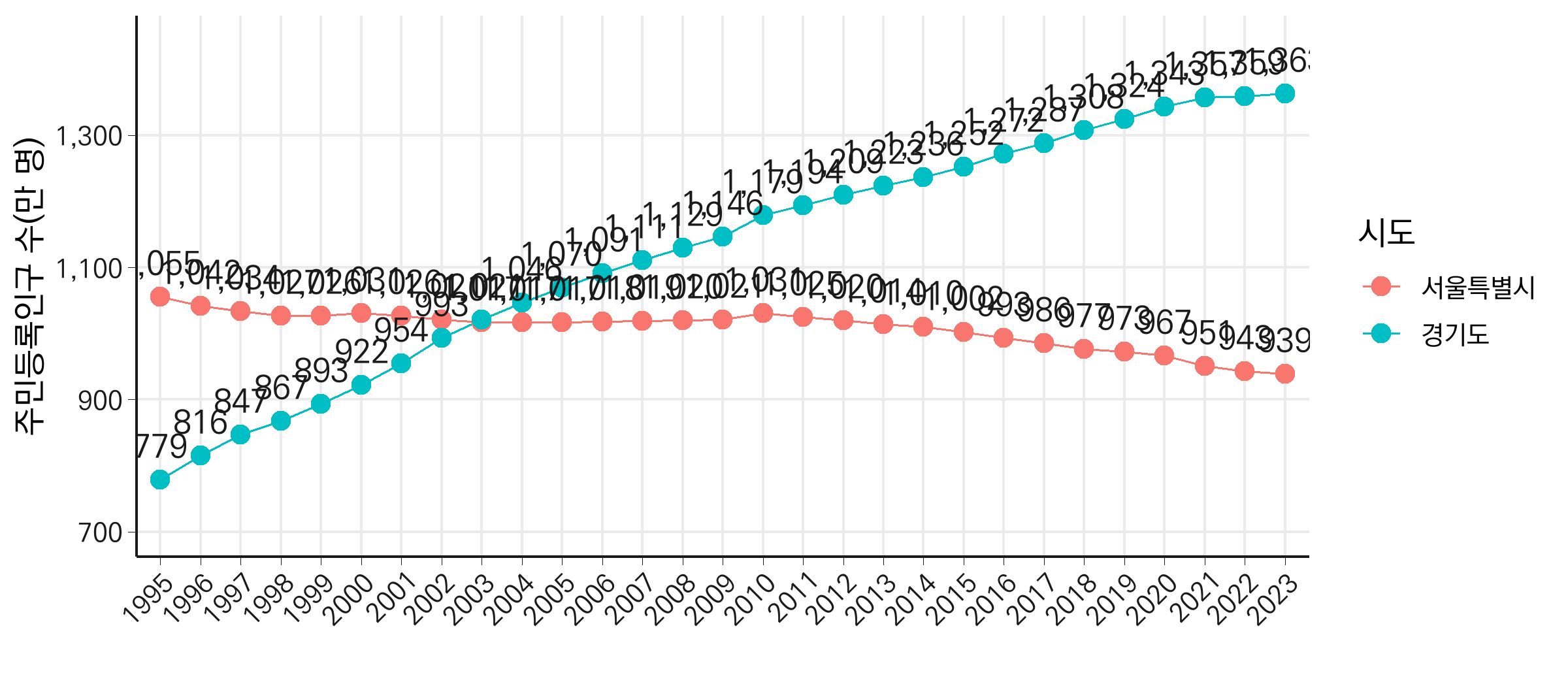1995년부터 2023년까지 서울과 경기의 주민등록인구 변화를 선 그래프로 시각화합니다. 데이터 포인트를 강조하기 위해 geom_point를 추가하고, 주민등록인구 값을 텍스트로 표기합니다. 그래프를 보면, 특정 시점에서 두 선이 교차하며 텍스트가 겹치는 문제가 발생합니다.
