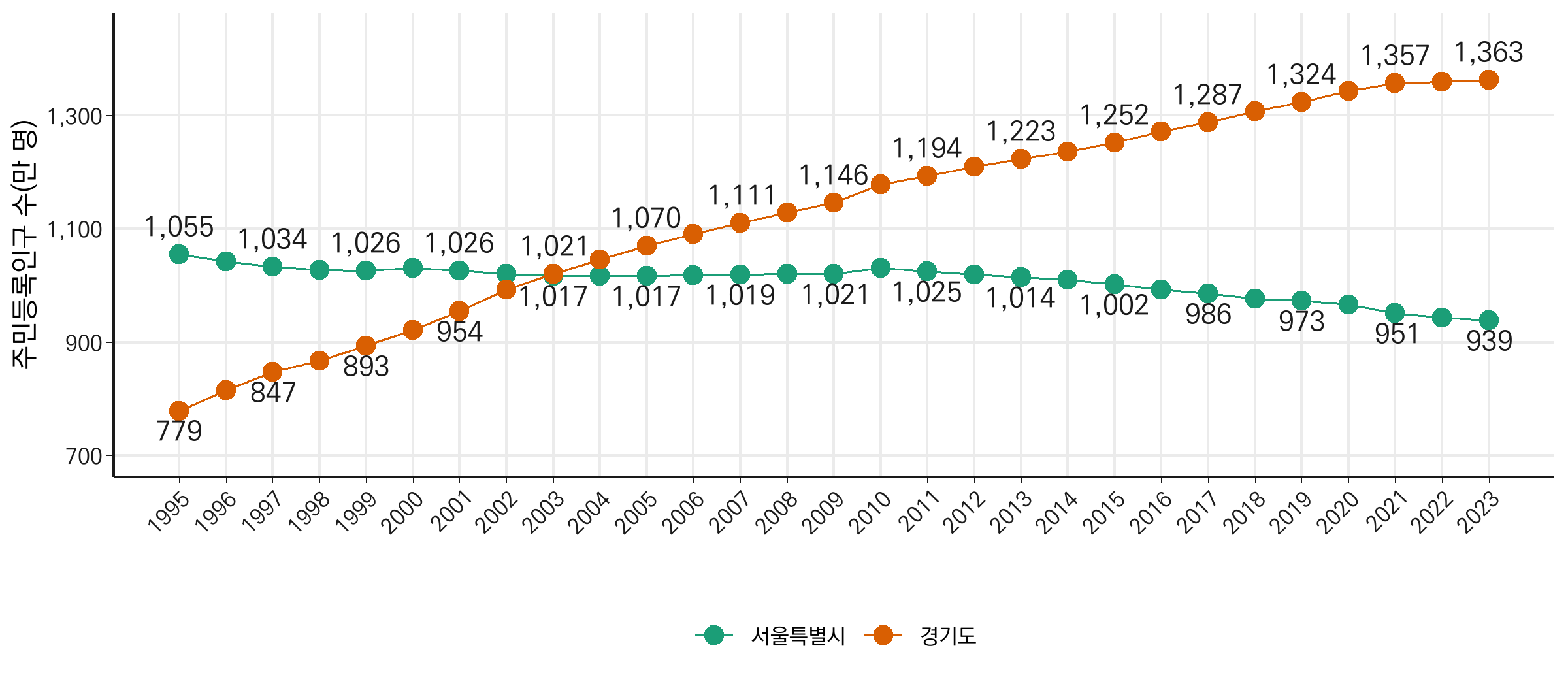 1995년부터 2023년까지 서울과 경기도의 주민등록인구 변화를 나타내는 그래프를 그리겠습니다. 다음 그래프는 교차 지점의 텍스트 중첩 문제 해결하기 글에서 그린 그래프를 활용한 것이며, 이 그래프를 p 변수에 저장합니다.