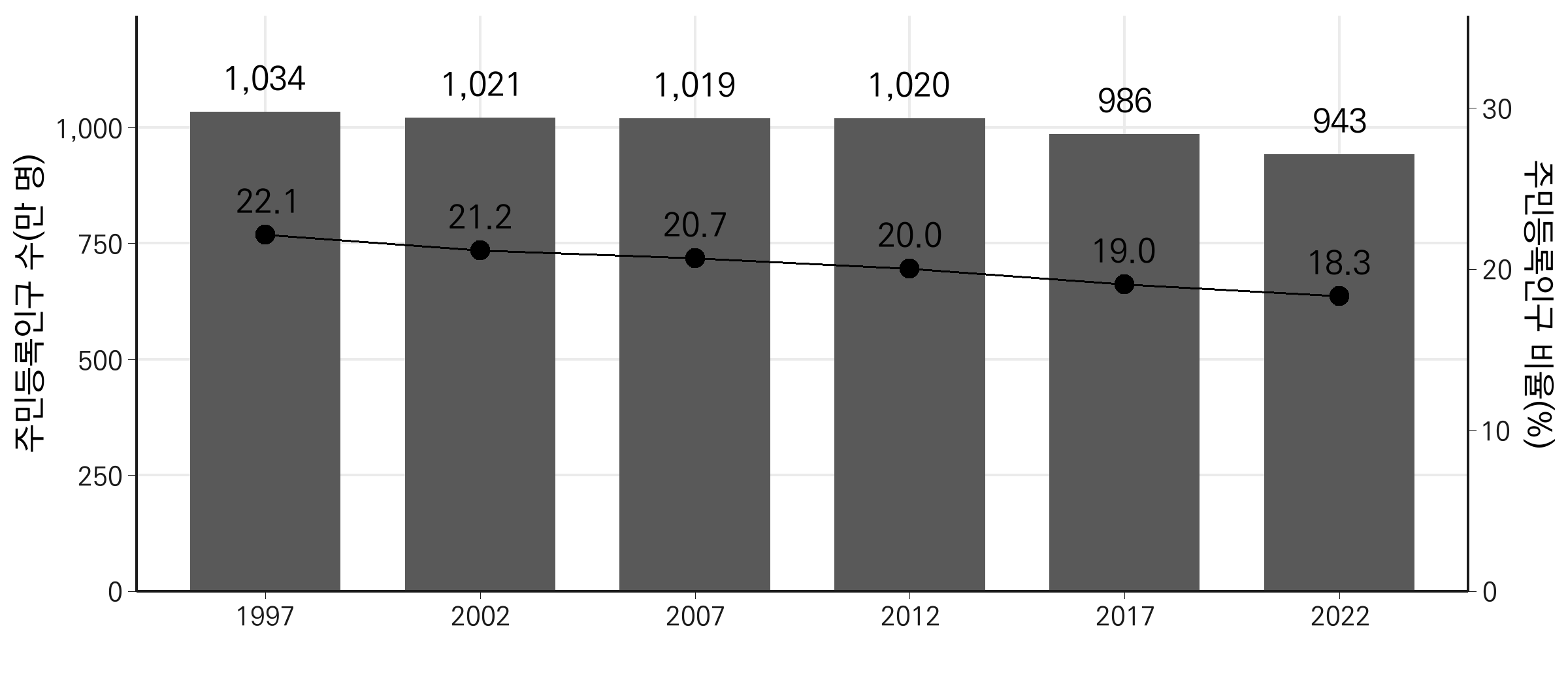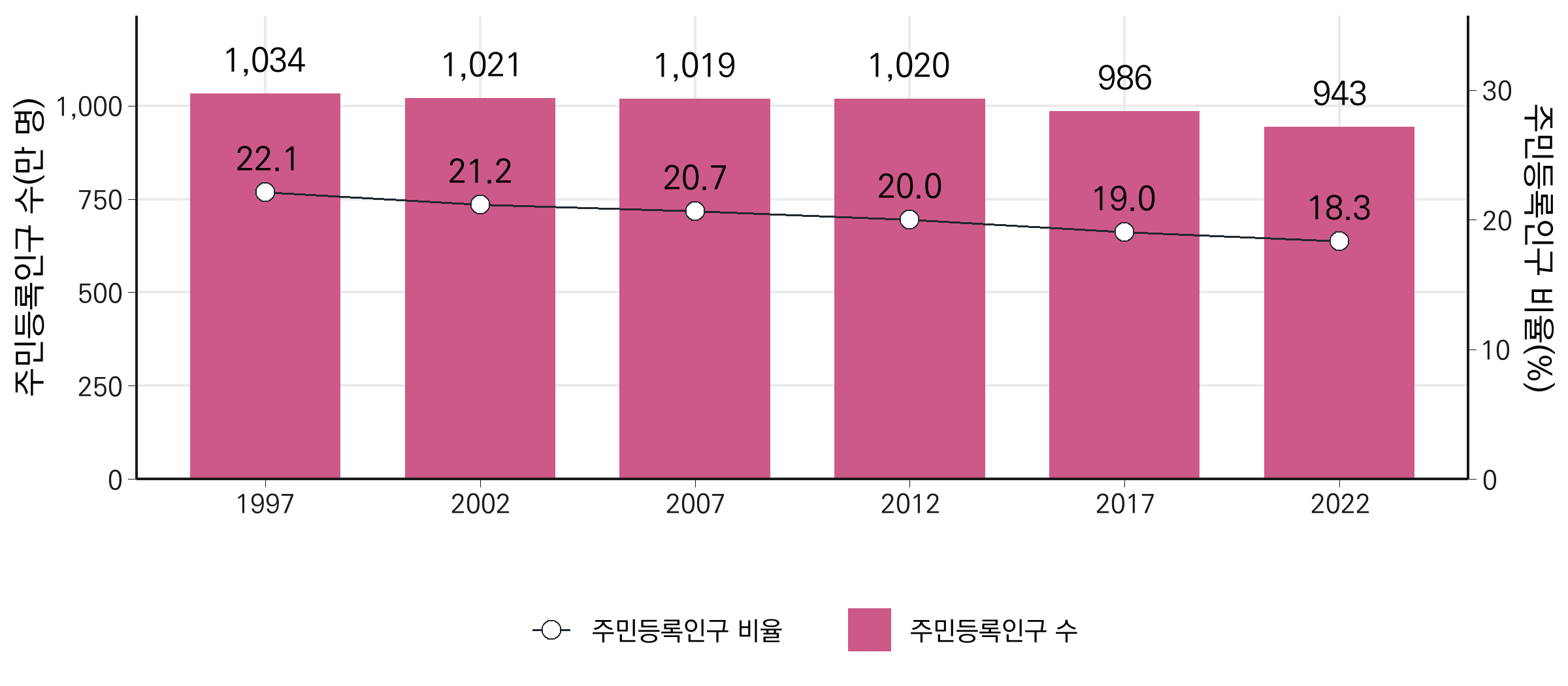 sec.axis = sec_axis(~./coeff, name = "주민등록인구 비율(%)",